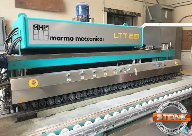 The LTT 621 is a continuous processing, polishing machine for rounded and flat edges up to 6 cm thickness. Much like the LTV its main features, there are: the compactness, the round shaping facility operated by means of just one cup-shaped diamond wheel for all radius, and the micro-oscillating facility of the polishing mandrels usable either for the flat edges, or for flat parts of edges (ex. between two rounded corners). The LTT is reliable because its most important mechanisms, such as the oscillating system are operated by means of levers and connecting rods and are basically derived from the thousands machines before like the LCT (vertical, extremely compact “bullnosing” machine) Marmo Meccanica has already produced. The compactness (only 14ft in length and 5ft in depth) in combination with its affordable price and its quality of performances make this machine ideal for those users looking for typical shop production. ADVANTAGES OF THE LTT 621: • Fully Automatic Horizontal Polisher• Production Speeds of up to 214 Lineal Feet per Hour• Processes pieces from 1-8 cm in thickness• 6 polishing heads allows for perfect polish every time• Automatically adjusts to find center of pieces for easy setup• Patented since 1985• Easy operation allows for fabricators ease of use and cross-training• Gauging plate included to gauge thickness of material and cut drip stones• 2 opposing mandrels set at 45° to help rough material into final shape• 2- 4ft extension tables and front extension allows for processing of large piecesSPECIFICATIONS OF THE LTT 621: • Number of Polishing Motors: 6• Number of Beveling Motors: 2• Number of gauging Motors: 1• Total Water Consumption: 15 gallons/minute• Total Power Requirement: 230v/3phase/100amps• Total Dimension of Machine: 14ft x 5ft x 6ft• Total Weight of Machine: 8,800lbs• Extension Tables: Standard 4ft in length• Working Speed: 23-214 Lineal feet per Hour• Maximum Abrasive Size: 5" or 150mm• Minimum material size: 8 inches x 10.6 inches• Maximum material size: NO MAXIMUM