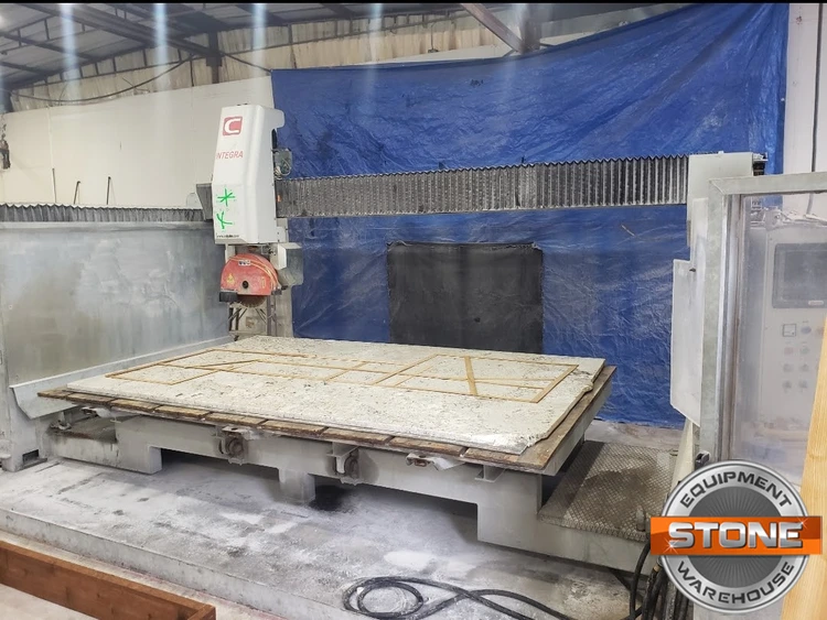 Saw bridge with 5 controlled and interpolated axes (3+2). Sawing machine with 5 numerically controlled axes (X-Y-Z interpolated with one another, C-A controlled), for processing of marble, granite and other natural stone. Particolary appropriate to cut steps and floors, to make profiles and bas-relief and also artistic working on solid blocks. It is fast, accurate and reliable, single block machine in rugged construction, built with electrowelded metal that has been hot galvanized and treated with special ceramic paints. 360° Rotation movement of the head and tilting of the head managed by CNC. Electric spindle disc motor with shaft of 50 mm. diameter bored for internal tool cooling. Tool fastening connection with ½ Gas with the thread on the left.