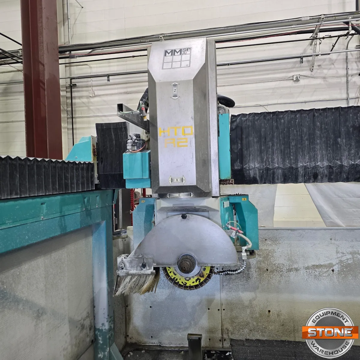 Single beam BRIDGE made of structural steel framing. Bridge translation on linear guides with sliding blocks (4-ways re-circulation). Centralized greasing blocks and water/dust protections. Movement powered by a precision brush-less motor on racks with inclined teeth.