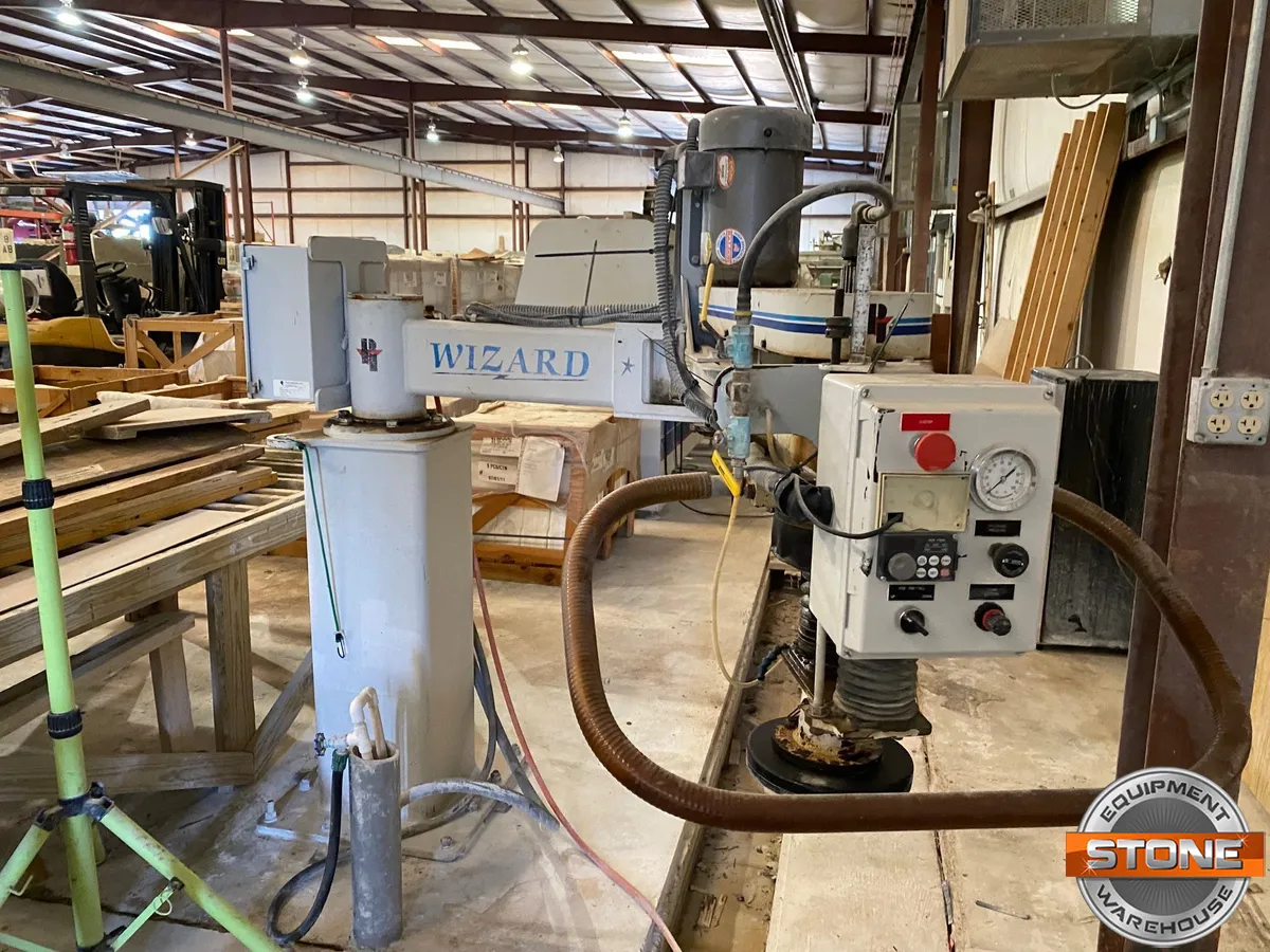 Under power, still operates but needs some maintenance for the rise and fall to operate smoothly. Still used to hone slabs.